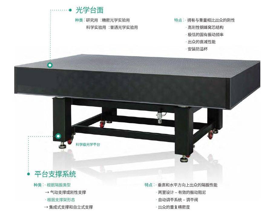 另外,使用由高性能空氣彈簧減振系統(tǒng)組成的支撐架,在各個方向上發(fā)揮著出色的減振性能。因此,能夠不受周邊環(huán)境影響,進行有效的精密光學(xué)實驗。