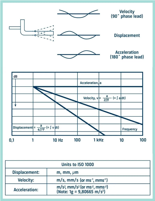 對于正弦信號,位移、速度和加速度幅度通過頻率和時間的函數(shù)在數(shù)學(xué)上相關(guān),如圖所示。如果忽略相位,如在進(jìn)行時間平均測量時總是這樣,則可以通過將加速度信號除以與頻率成比例的因子來獲得速度水平,也可以通過將加速度信號除以與頻率的平方成比例的因子來獲得位移。這種除法計算在測量儀器中以數(shù)字方式執(zhí)行。